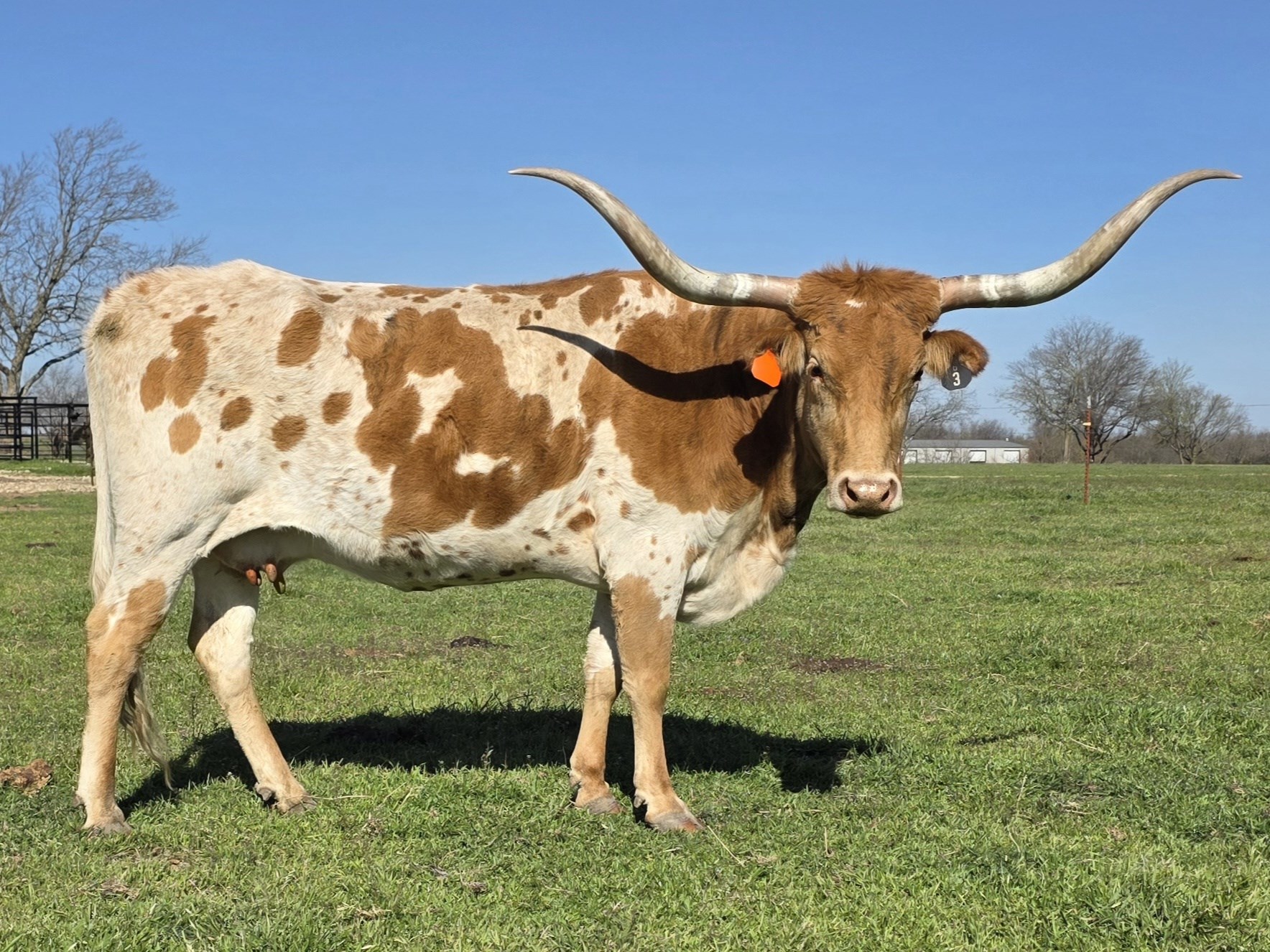 Meet MAGA, this Texas Longhorn cow features a striking white and reddish-brown coat with a pattern of spots across its body. Her long, gracefully curved horns extend outward, showcasing the iconic trait of this breed.