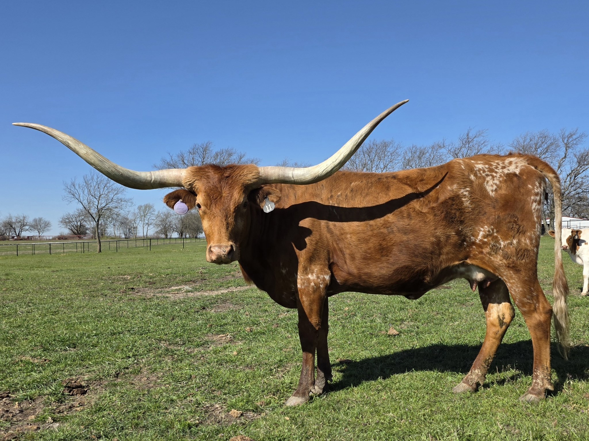 Meet Royal Red 48, a breathtaking cow with a rich, deep red coat that radiates strength and elegance. Her smooth, sleek frame is complemented by an impressive set of long, gracefully arched horns that add to her regal presence. With a confident stance and a poised demeanor, she embodies the resilience and beauty of her breed.
