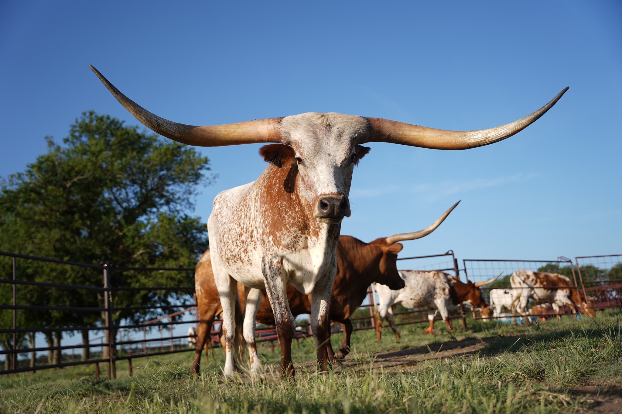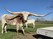 Meet Call Sign Magnum, he is a handsome bull with a stunning white base coat, beautifully accented by spotty auburn markings peeking through. His thick, straight-out horns make a bold statement, enhancing his strong and robust physique. This bull is not only visually striking but also healthy and well-built, making him an excellent choice for breeding or as a standout addition to any herd.