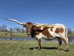 Meet Wind Jammer, a stunning cow with a pristine white coat accented by striking brown socks and patches, creating a unique and eye-catching look. Her incredible 85-inch triple twisting horns are truly impressive, adding a bold and majestic touch to her already stunning appearance. This cow’s combination of beauty, strength, and her remarkable horns makes her a standout in any herd.