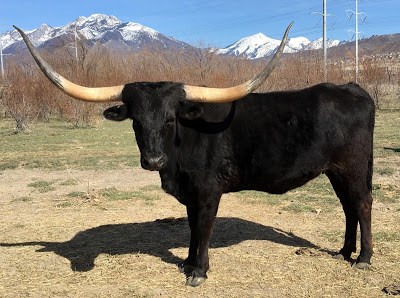 This fantastic girl is our best! She is about three-quarter inches shy of 80 inches ! (and that is after she broke 4 inches off of her left horn a few years ago). The fantastic bull LC Bladen on top and KC Clarabelle on the bottom. She really is something special. Four black and white heifers in a row!